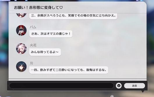 同じくカフカ同行クエにて、仙舟に来て魔陰の暴走が酷くなってしまい、カフカに対して非常に手をかけた。治まったら治まったで「会いたい人が居る」としてカフカと別行動した。(カフカは私と来ないの⁉と、驚いていた)従順ではあるものの案外、好き勝手している。またカフカも刃を信頼して任せては居る。景元など、また感情が揺れかねない自分に関連する人間に会いに行くな。と、忠告されていたが、鏡流同行クエにて、しれっと白露に会っていた。そればかりか同窓会に出席していた。地味に言う事聞かない。